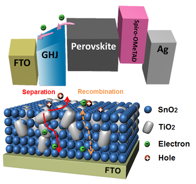 溶液过程处理的有机-无机铅卤化物钙钛矿太阳能电池(PSCs)由于其高效、低成本、可制备柔性器件等关键优势成为现今非常有前景的光伏技术。电子传输层(ETL)作为钙钛矿太阳能电池的核心部件,由于其可以选择性地收集在钙钛矿光吸收层中产生的光生电荷载流子并且防止载流子在界面处的复合,成为提高钙钛矿太阳能电池光电转换效率的决定性因素之一。针对平面异质结钙钛矿电池中氧化钛电子传输层较低的本征电子迁移率以及较高的迟滞效应等关键问题,该研究工作首次提出一种低温溶剂热法制备功能化SnO2/TiO2梯度渐变异质结并将其应用于钙钛矿太阳电池ETL的结构设计中。