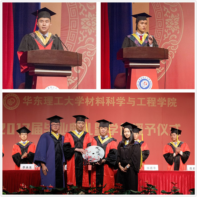 本科生代表高材144班高静铭、研究生代表14博士班陈潇先后发言,分享了在华理求学的点点滴滴,表达了对母校的千般眷恋,万般不舍。随后,两名毕业生代表向学院敬献礼物“难忘师恩”。