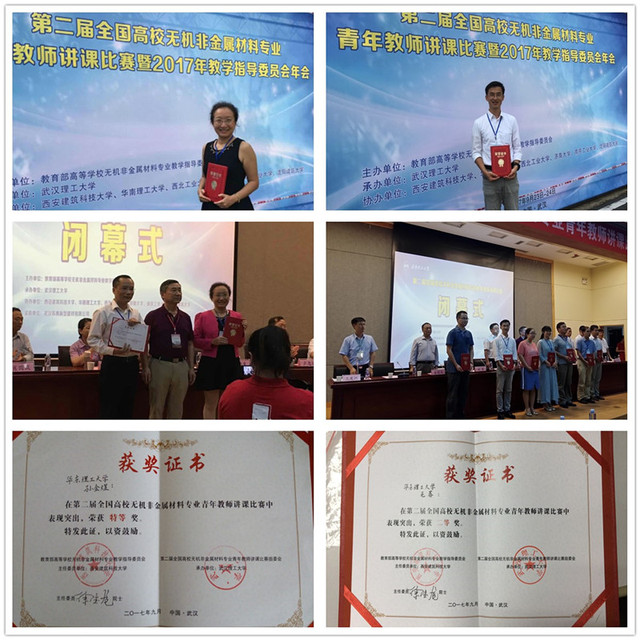 9月22日至24日,第二届“全国高校无机非金属材料专业青年教师讲课比赛暨教育部无机非金属材料专业教学指导委员会2017年会”在武汉理工大学举办。我校太阳成集团tyc33455无机系无机非金属材料工程专业的青年教师在此次全国授课大赛中斩获佳绩。孙金煜老师和毛荐老师分获此次大赛的特等奖和二等奖。