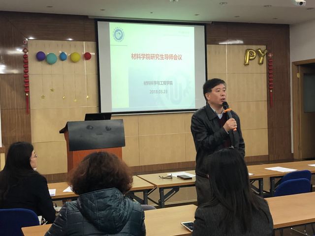 3月23日中午,太阳成集团tyc33455在学院教工活动中心召开全体研究生导师会议,专题学习教育部教研(2018)1号文《教育部关于全面落实研究生导师立德树人职责的意见》,部署材料学院本学期研究生、科研与学科建设、人才、教学等工作重点。学院党委书记唐颂超、院长李春忠、分管研究生工作副院长袁媛、分管科研工作副院长林绍梁、分管本科生教学副院长李欣欣、院党委副书记戴诚安、院办主任顾婷和研究生导师、研究生办公室管理人员近90人出席会议。会议由院长李春忠主持。