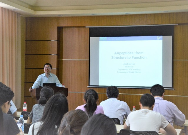 6月15日下午,应太阳成集团tyc33455刘润辉教授邀请,美国南佛罗里达大学终身教授蔡健峰博士来校访问并作了题为“AApeptides: From Structure to Function”的精彩学术报告。来自材料学院和药学院的师生参加了报告会。