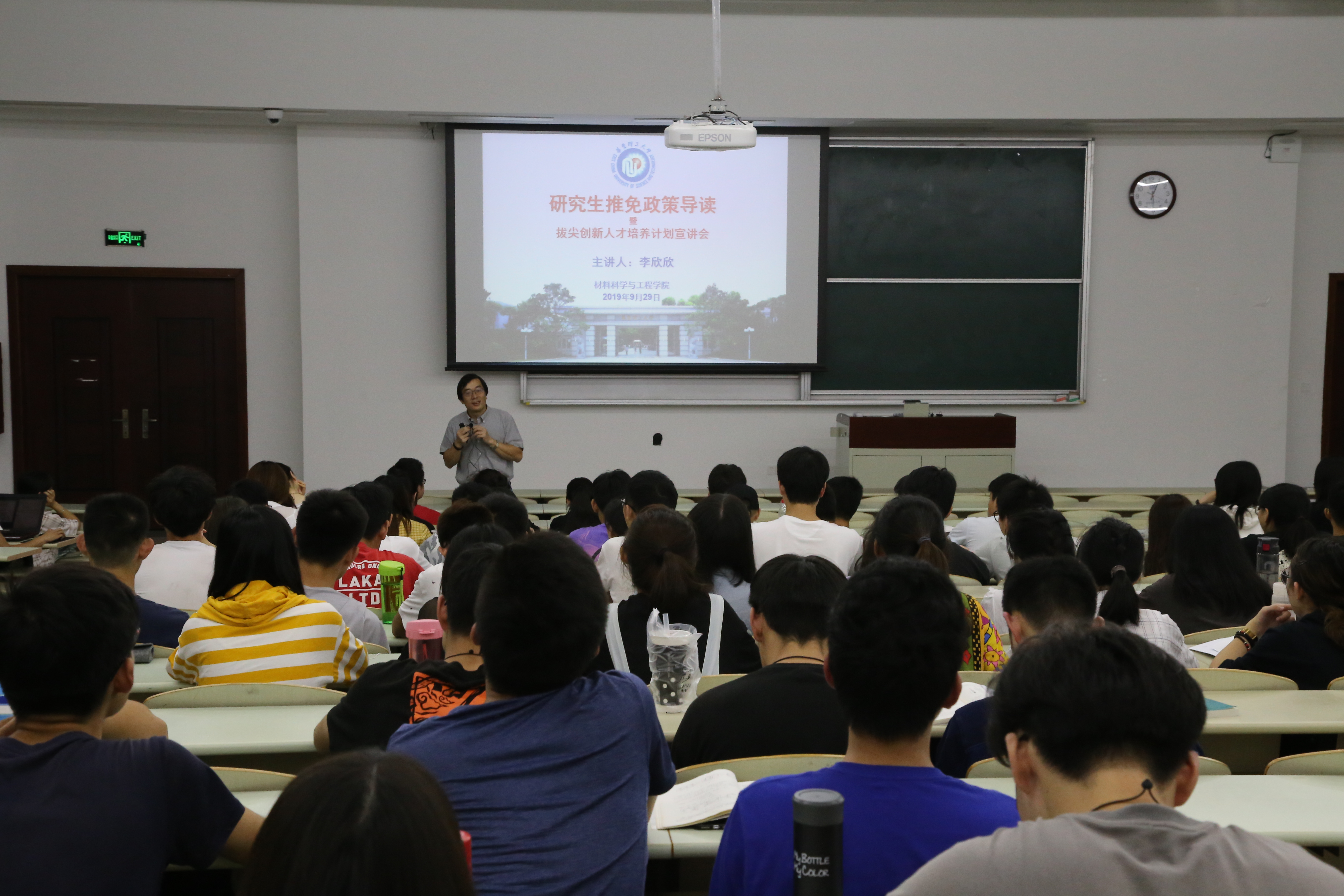 9月29日,材料学院“推免招生政策”及“2019年拔尖创新人才计划”宣讲会在奉贤校区B教100举行。本次宣讲会由副院长李欣欣主持,胡彦杰副院长与2018级全体本科生参加。