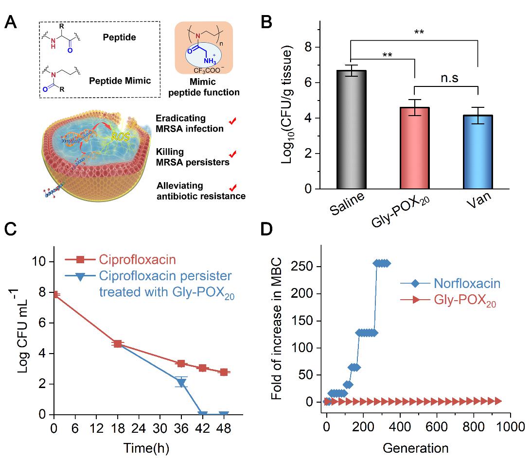 刘润辉教授课题组首次实现基于恶唑啉聚合物(聚恶唑啉)的多肽模拟,以宿主防御肽为模型展示了以恶唑啉聚合物模拟宿主防御肽并获得对耐甲氧西林金葡菌的体内、体外高效抗菌活性。优选的聚恶唑啉分子还显示了相对于传统抗生素的几项突出优点:对高度耐药的休眠细胞同样有效;连续使用,细菌未获得耐药性;经聚恶唑啉抗菌分子刺激近1000代后的细菌对常规抗生素敏感度不变,未发现交叉耐药问题。聚恶唑啉抗菌分子的上述突出优点可针对性的解决耐药微生物感染的核心难题。