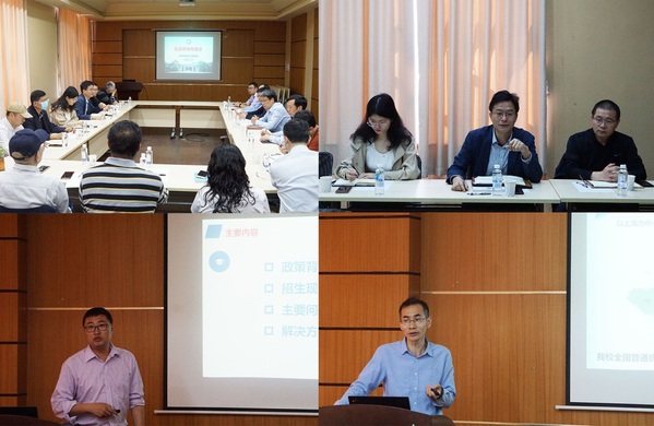 招生办副主任朱涛解读了新高考模式,表示要加强与学院的沟通交流,合力提升学校学院生源质量,从各专业对物理、化学等考试科目的要求、优质生源基地建设、加强与优质高中的互动联系等方面具体展开。