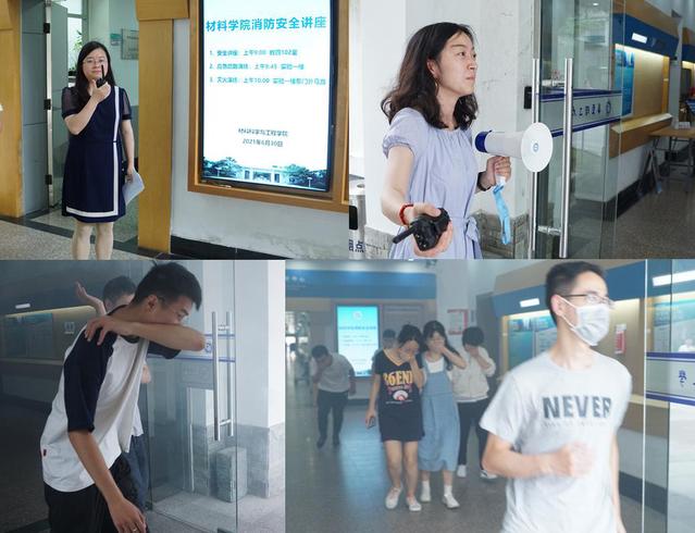 安全讲座后,学院在实验一楼进行了应急疏散演练。随着袁媛书记一声“2021年材料学院应急疏散演练现在开始”的命令下达,实验一楼内响起了“本楼发生火情,请大家立即撤离”的广播声,全体师生快步走出房间,在疏导员的指引下,沿着就近楼梯有序离开大楼。