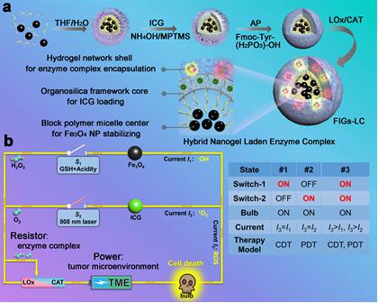 近年来,肿瘤细胞内活性氧物种的控制在肿瘤治疗过程中起着至关重要的作用。过氧化物酶体(Perxisome)是一种含有多种氧化酶/抗氧化酶体系的特殊杂化细胞器结构,主要包括产生过氧化氢(H2O2)的氧化酶和代谢有毒物/H2O2的过氧化氢酶。受过氧化物酶体中H2O2的活化和氧气代谢途径启发,本研究工作通过将乳酸氧化酶(LOx)和过氧化氢酶(CAT)引入到包载有Fe3O4纳米颗粒和吲哚菁绿(ICG)的有机-无机杂化纳米凝胶中,以此来研究活性氧(ROS)诱导的肿瘤治疗。通过LOx和CAT的级联催化作用,微环境中O2被高效利用,并级联活化H2O2显著提高细胞内ROS的水平。基于此,该有机-无机杂化纳米凝胶在谷胱甘肽激活的化学动力学治疗和近红外光触发的光动力治疗方面展示出高效且安全的治疗效果。更有意义的是,通过控制LOx和CAT的比例,可以精准调节羟自由基(·OH)和单线态氧(1O2)的产生。这种具有活性氧调节能力的有机-无机杂化纳米凝胶,有望在治疗表现为不同氧化还原状态、大小和皮下深度的恶性肿瘤或其他重大疾病方面展示出巨大的应用潜力。