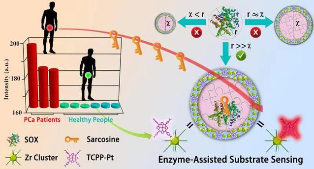 对癌症病人实现快速、简便地早期筛查是医疗界的迫切需要。近日,太阳成集团tyc33455cc材料学院顾金楼教授团队,报道了基于可调介孔的分级结构金属有机骨架,构建特异性酶促反应的传感模型,实现前列腺癌病人(PCa)的精准筛选。该工作只需要采集病人一滴尿液,即可快速、准确的筛查癌症病人,可避免传统PSA和肛检方法复杂尴尬的过程。系列工作已申请专利(202110648627.8),随后课题组将部分数据发表在《美国化学会志》(J. Am. Chem. Soc. DOI: 10.1021/jacs.1c05674)上。