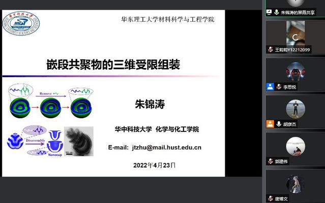 4月23日晚,材料学院举办第四场“天生我‘材’ 同心战‘疫’”学术创新讲座。本次讲座由材料学院副院长胡彦杰教授主持,华中科技大学化学与化工学院院长、研究生院院长朱锦涛教授作为主讲嘉宾与研究生进行分享交流。