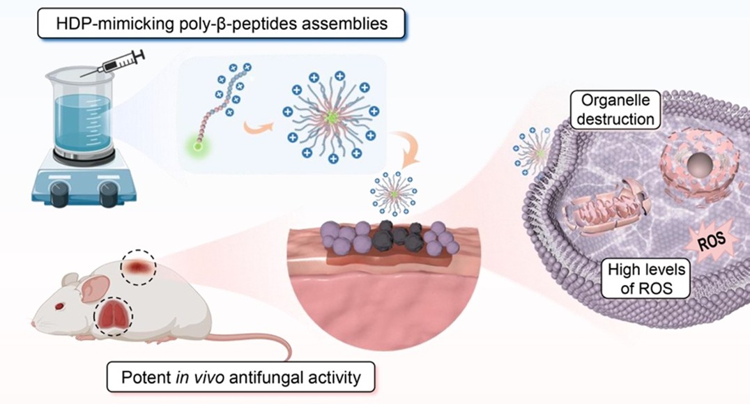 本研究中,刘润辉教授课题组通过整合聚-β-多肽和聚(肌氨酸)的优势,设计了自组装聚(肌氨酸)功能化宿主防御肽模拟物,并建立了类嵌段聚-β-多肽的单锅敞口合成方法。合成的优选聚-β-多肽组装体具有出色的批次间重现性,对耐药真菌具有强效和高选择性的抗菌活性,能有效根除成熟生物被膜,并表现出出色的生物安全性和体内抗真菌功效。值得注意的是,由于细胞器破坏和高水平活性氧生成相关的多靶点作用机制,真菌无法对组装体产生耐药性。这项工作为设计合成宿主防御肽模拟物组装体和治疗耐药真菌感染难题提供了新思路。