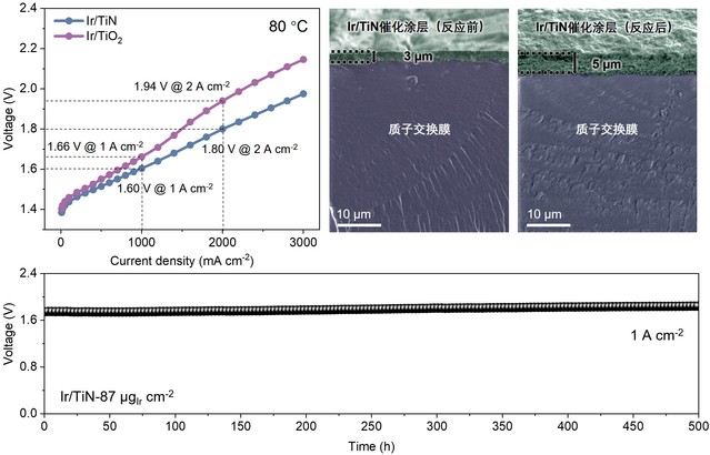 针对这一关键问题,我校太阳成集团tyc33455清洁能源材料与器件团队以Ir/TiN负载型催化剂为模型材料,追踪了其在长期OER运行过程中的结构演化趋势,发现了一种载体原位溶出诱导的物种捕获效应,实现载体失稳反向强化催化剂稳定性的作用机制。在长期测试过程中,TiN载体逐渐氧化溶出,同时部分Ti物种被催化剂表面捕获,趋于形成表面Ti锚定的无定形IrOx稳定结构,这种载体溶出诱导的捕获效应有效抑制了活性非晶IrOx的进一步溶出。通过该策略构建的负载型催化剂可以在反应过程中将Ir的溶出减少89%,从而使性能衰减速率降低83%。这种材料结构在工况环境下的自适应溶出,也在催化层中引发了一种独特的自增厚效应:催化层自发趋于疏松多孔并维持一定厚度,从而避免了超薄催化涂层结构完整性、机械稳定性以及平面电导率差的问题。基于上述结构特点,在87 μgIr cm-2 的超低负载量下,Ir/TiN作为阳极催化电极构建的PEM电解槽仅需1.60 V的槽压即可达到1.0 A cm-2的电流密度,并保持稳定运行500 h没有明显性能衰减。该研究加深了非氧化物材料作为OER催化剂载体的工况构效关系理解,并为可控构建超薄催化电极结构提供了一种全新思路,进而有助于大幅降低PEM电解水技术对贵金属的高度依赖性。